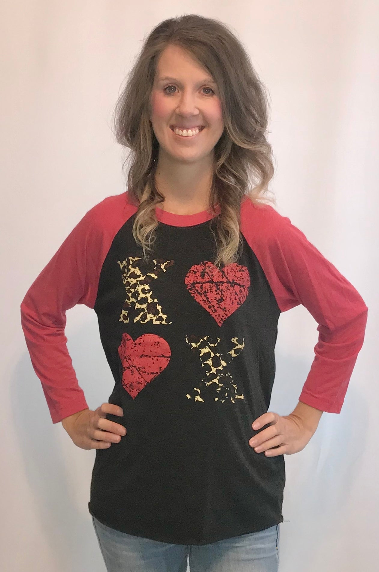 Spread some love with our XOXO leopard tee! Perfect for Valentine's Day, this tee features a playful XOXO print and a fun leopard detail, all on a comfortable 3/4 sleeve shirt. Show your wild side and your love simultaneously with this unique tee.